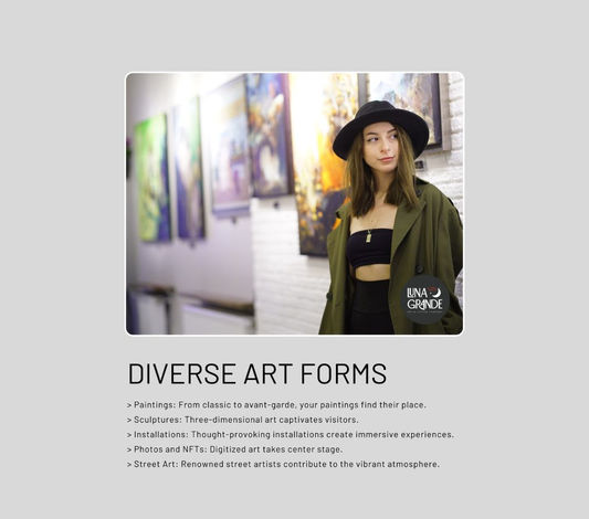 The gallery space rental covers various services, including Print and frame costs, social media promotion & PR, photography, organization of the opening cocktail, design of the exhibition poster, and management of advertisement contents.